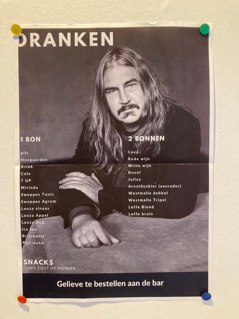 Het zal je misschien verrassen, maar later die avond kwam ik héél voldaan thuis mét een gesigneerd boek en zelfs mét een poster. Die had ik op het laatst nog kunnen mee grissen. Ik had hem in twee geplooid en weggestoken in mijn boek. Nu hangt hij boven mijn bureau. Daar zal hij me aanmoedigen en inspireren bij het schrijven. Van tussen vier duimspijkers kijkt hij me aan, in zwart-wit, wat voorover geleund, links geflankeerd door de dranken van één bon en rechts de dranken van twee bonnen. Boven zijn hoofd stond er ‘drankkaart’. Dat heb ik eraf geknipt.