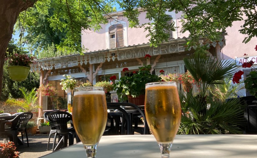 Als de kaart van Frankrijk een lichaam zou zijn, dan is Parijs het pompend hart en de streek, rond Bordeaux, links onder in de flank, de lever. Het is daar, op die plek, diep in de buik van Frankrijk, dat wij ons schuilhouden deze zomer. En dat te midden van een hittegolf. Het is dus essentieel dat we op tijd iets drinken, wat we uiteraard gewillig doen. We wagen ons wel eens aan een wandeling, of doen toch een poging tot. Maar als het zo broeierig heet is dat zelfs de vogels geen moeite meer doen om te fluiten, dan moet je de toerist niet uithangen. Dus houden we meestal halt bij een schaduwrijk terras in ons dorp. Zoals nu. Om de cafébaas te ontzien -en ook omdat we dorst hadden- is Filip bij aankomst meteen twee pintjes aan de toog gaan bestellen. De man was nog even in de weer met zijn tv-toestel, maar beloofde die zo meteen te brengen. En dus zitten we braaf te wachten op twee frisse biertjes.