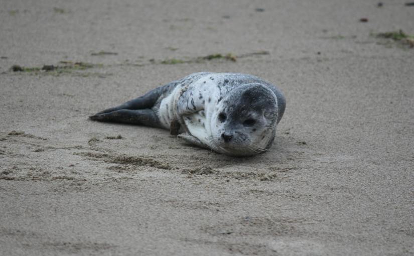 Ik sta op en stap door tot op het donkerste kleur zand dat het best begaanbaar is. Welke kant ik uit ga, maakt niets uit, dus loop ik gewoon met de wind mee. Ik kruis enkele wandelaars, meestal vergezeld door hun viervoeters, een paar joggers en zelfs twee ruiters die langs de zee galopperen. Ik kan niet paardrijden maar als je dit ziet, zou je het willen kunnen. Na een poosje stappen, zie ik in de verte twee figuren staan met oranje fluohesjes. Het lijkt me wat vreemd. Is het politie? Is er iets gebeurd? Een ongeval, een moord? Als ik naderbij kom, zie ik nu ook oranje kegeltjes in een wijde cirkel op het zand. Midden in die cirkel ligt er iets. Ik kan niet goed zien wat het is, maar in mijn ogen lijkt het gewoon op een hoopje zand. Omdat ik nu echt wel nieuwsgierig ben, wandel ik wat dichter naar de fluojassen toe. Het zijn geen agenten maar gewoon twee burgers met een fluorescerend hesje die de cirkel lijken te bewaken. Omdat de mannen de indruk wekken dat ze zich toch maar een beetje staan te vervelen, durf ik vragen wat er gaande is. Hij wijst naar het midden van de cirkel, ‘Een zeehondje,’ zegt hij, ‘het is aangespoeld en wil uitrusten. Wij waken erover dat niemand het lastig valt of opjaagt, zodat het kan rusten en straks met de zee terug kan wegzwemmen.’